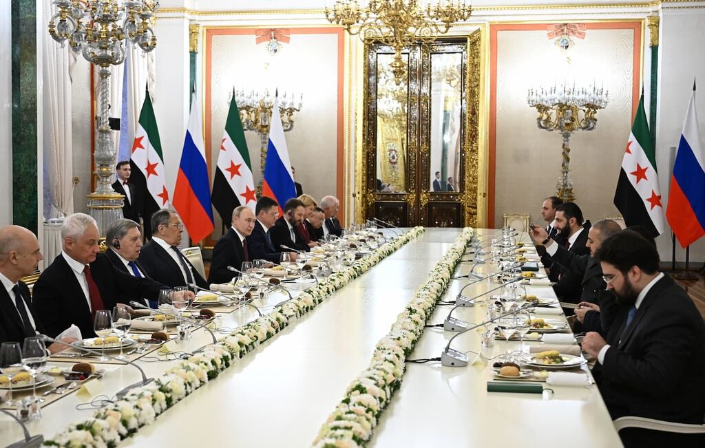 Al-Sharaa met Syrische delegatie in het Kremlin op bezoek bij Poetin en zijn veiligheidsministers. Foto: Sergey Bobylev / ANP / EPA