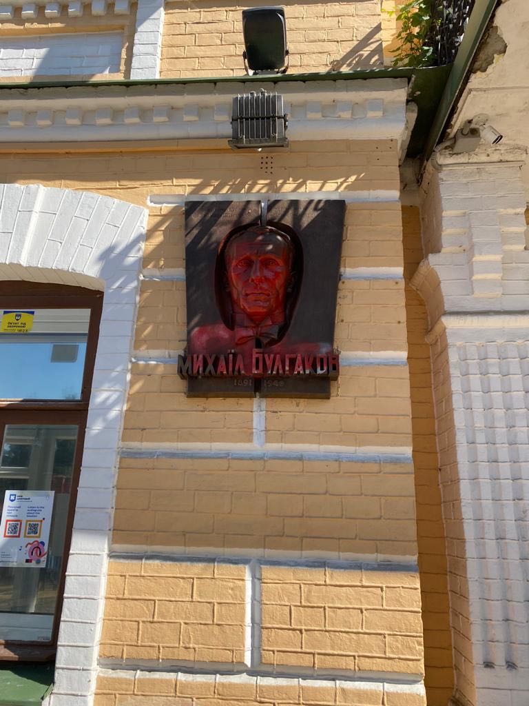 Op maandag 26 juni liep ik van een afspraak in de benedenstad Podil langs de Andreivski Spoesk de steile helling naar de bovenstad van Kyiv op. Een westenwind dreef de laatste regenwolken uit de lucht, die aangenaam koel aanvoelde na de hitte van het afgelopen weekend. Halverwege passeerde ik het statige herenhuis waar in de periode van de Eerste Wereldoorlog de Russische schrijver Michail Boelgakov heeft gewoond. Het is nu een klein aan hem gewijd museum dat gesloten was. Zijn bronzen hoofd op de voorgevel was met rode verf besmeurd.