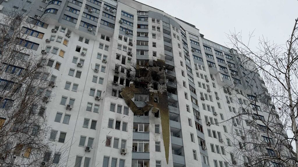 Flatgebouw in de Kyivse wijk Osokorky waar op 9 januari een drone insloeg. Foto: Chris Colijn